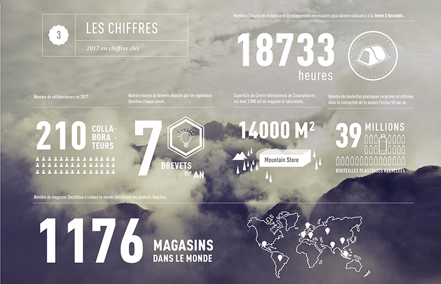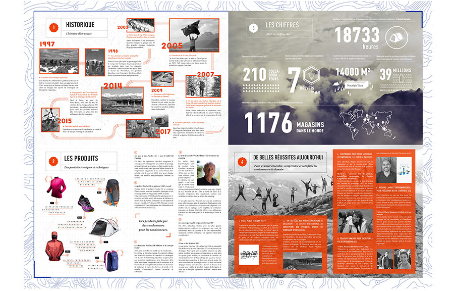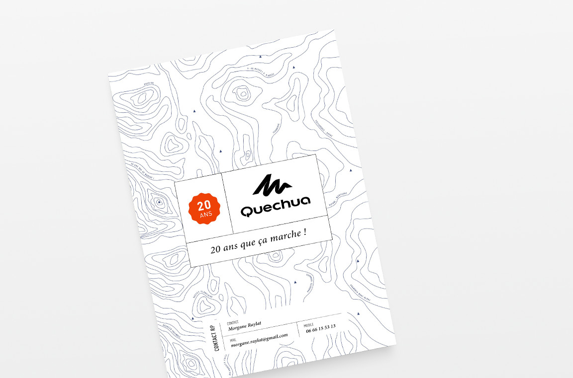 Conception graphique du dossier de presse Quechua pour célébrer les 20 ans de la marque. Poster présenté au format d’une carte topographique, pliée en 4.