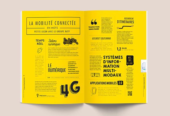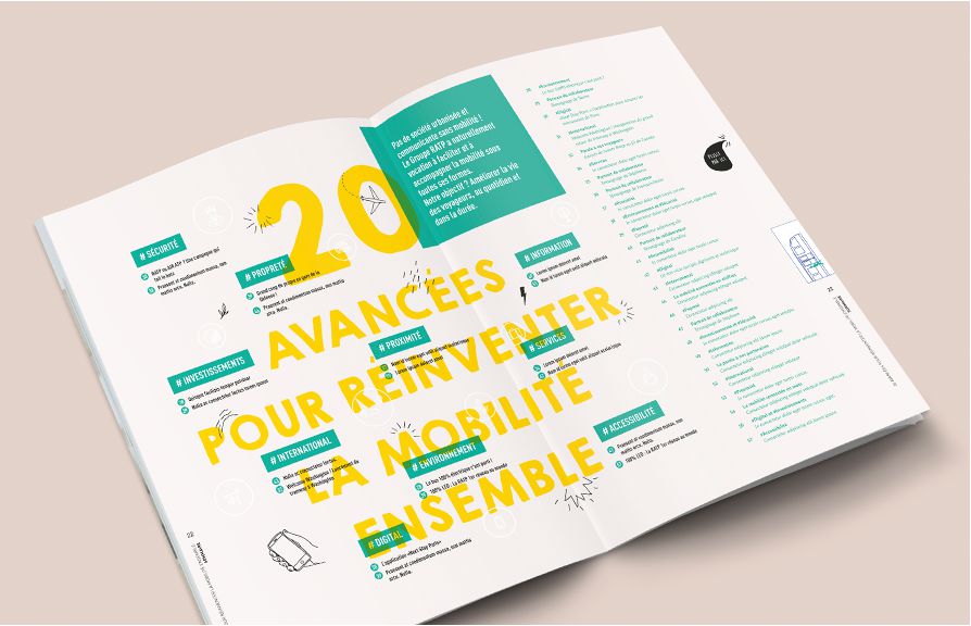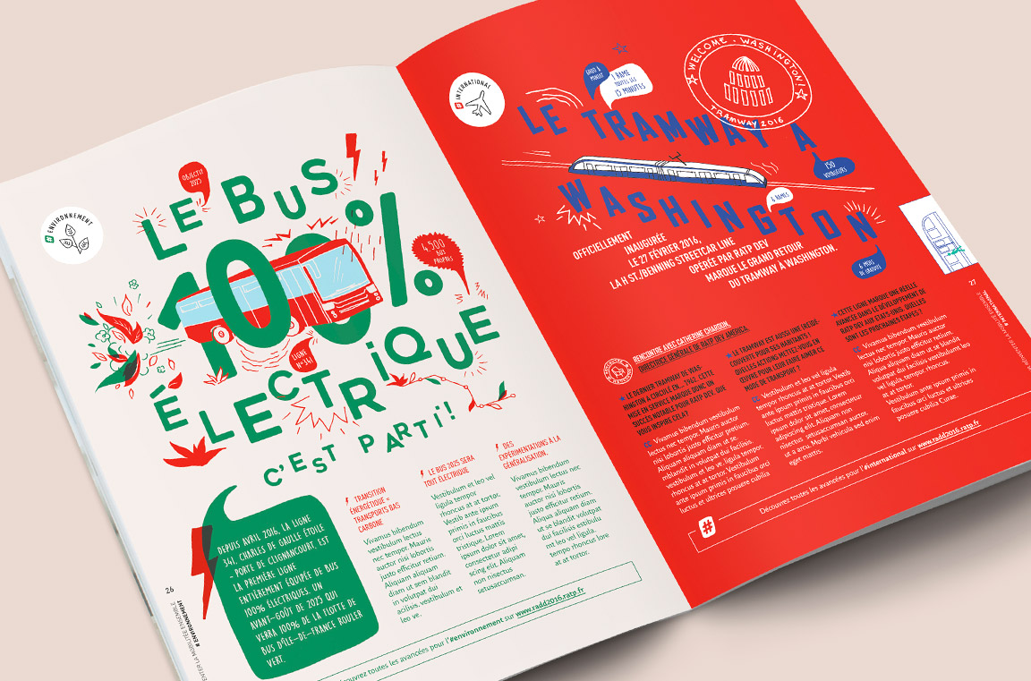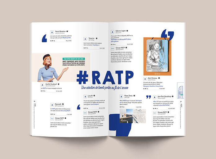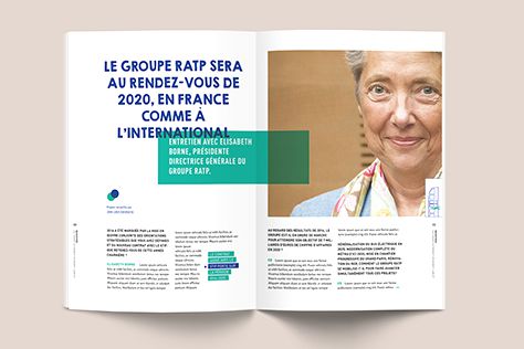 Création de la maquette du rapport annuel pour la RATP, traité en 2 volets : 1 partie magazine illustré et 1 partie institutionnelle.