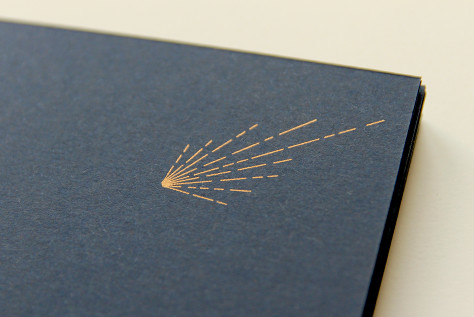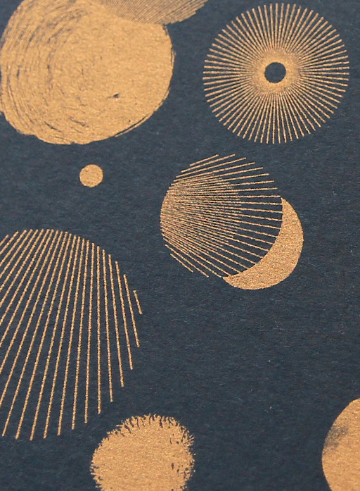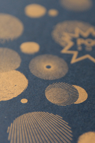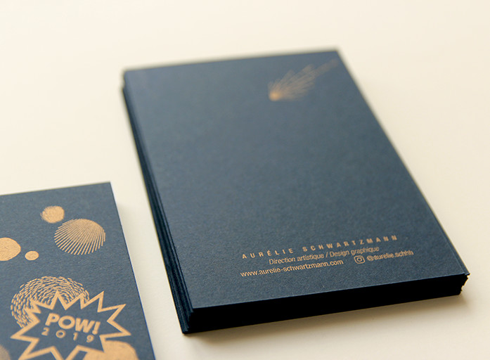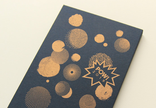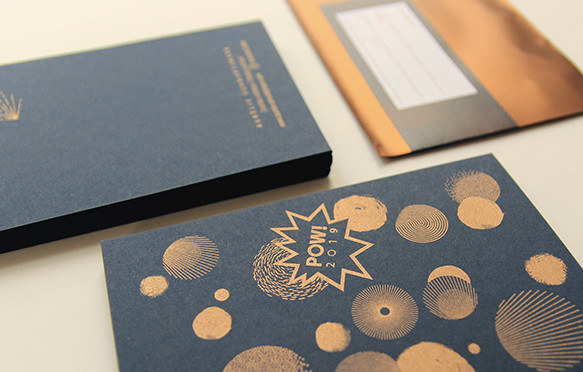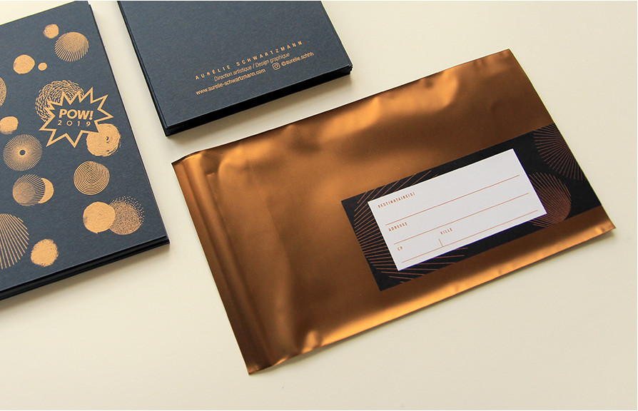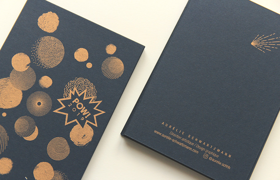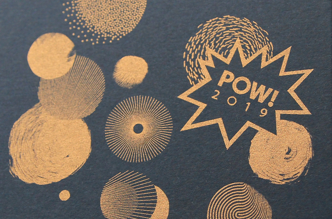 Pow ! Carte de vœux, imprimée en Risographie à l'encre dorée.